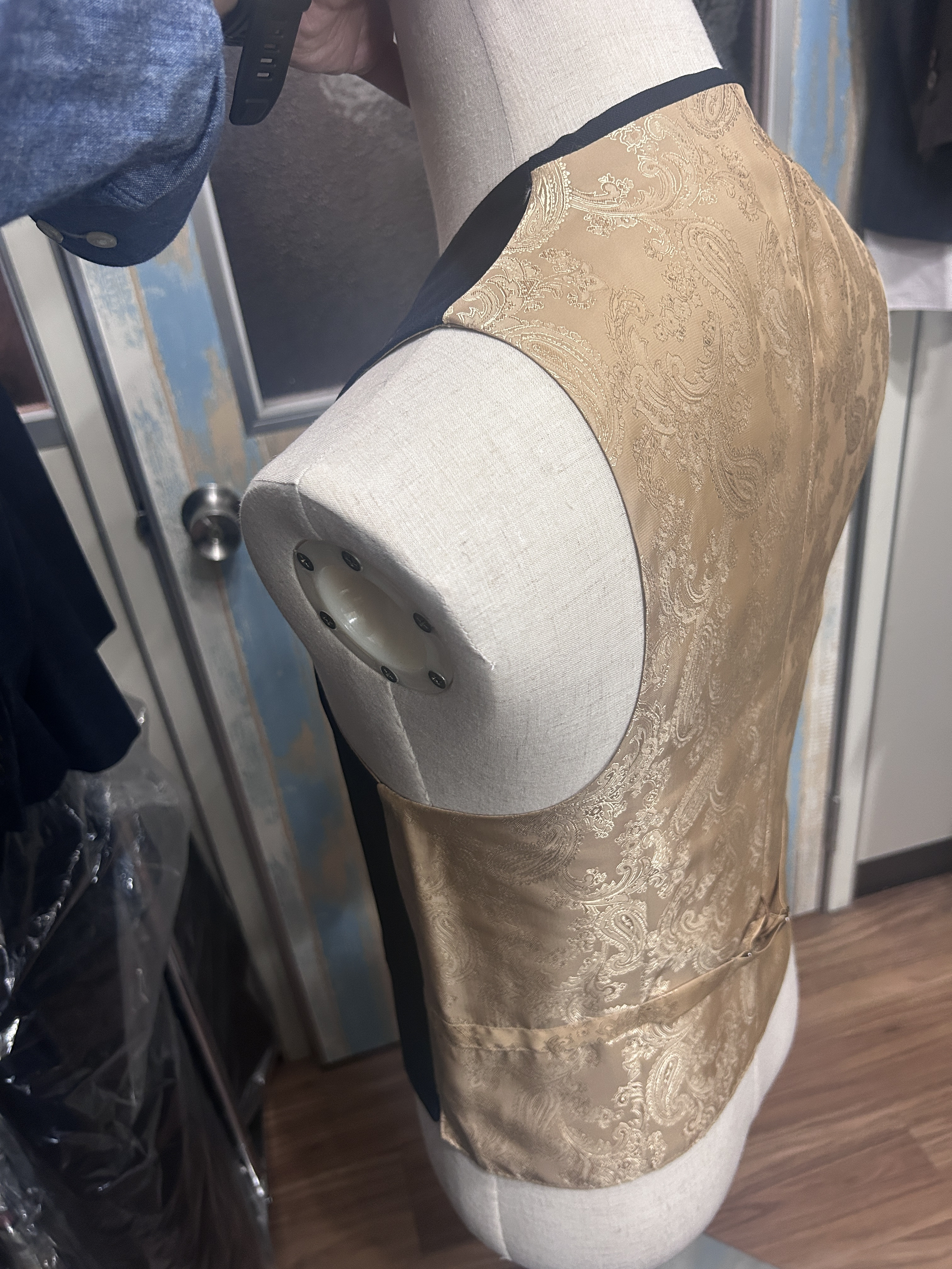 ネイビーのスリーピース白の貝ボタンとゴールドのペーズリー柄裏地がポイントです、ベストの背中もゴールドペーズリーにて